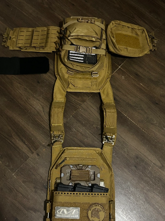• Plate Carrier Coyote Brown : Équipé d'un Flatpack, poches chargeurs et patchs (Mechanix, Spartan).