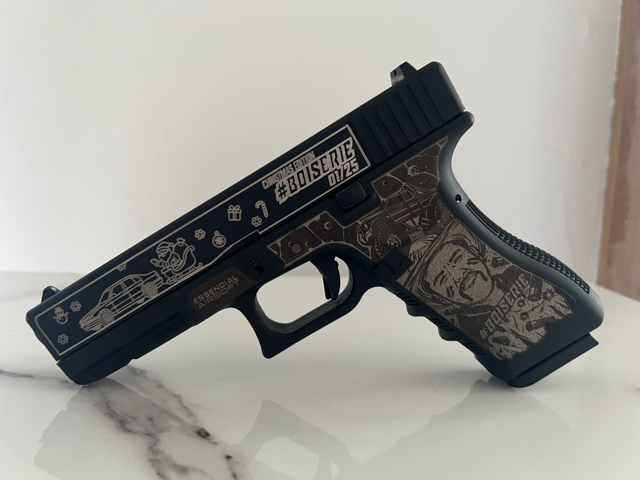 Je mets en vente un Glock 17 airsoft à gaz (GBB) avec recul de culasse (blowback), en édition spéciale La Boiserie – Noël, ultra limitée à seulement 25 exemplaires.