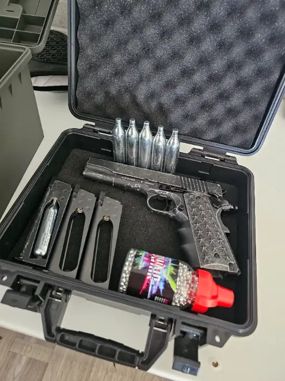 La vente contient la Réplique, 3 chargeurs, un biberon de billes, la malette de transport, et 30 capsules de CO2.