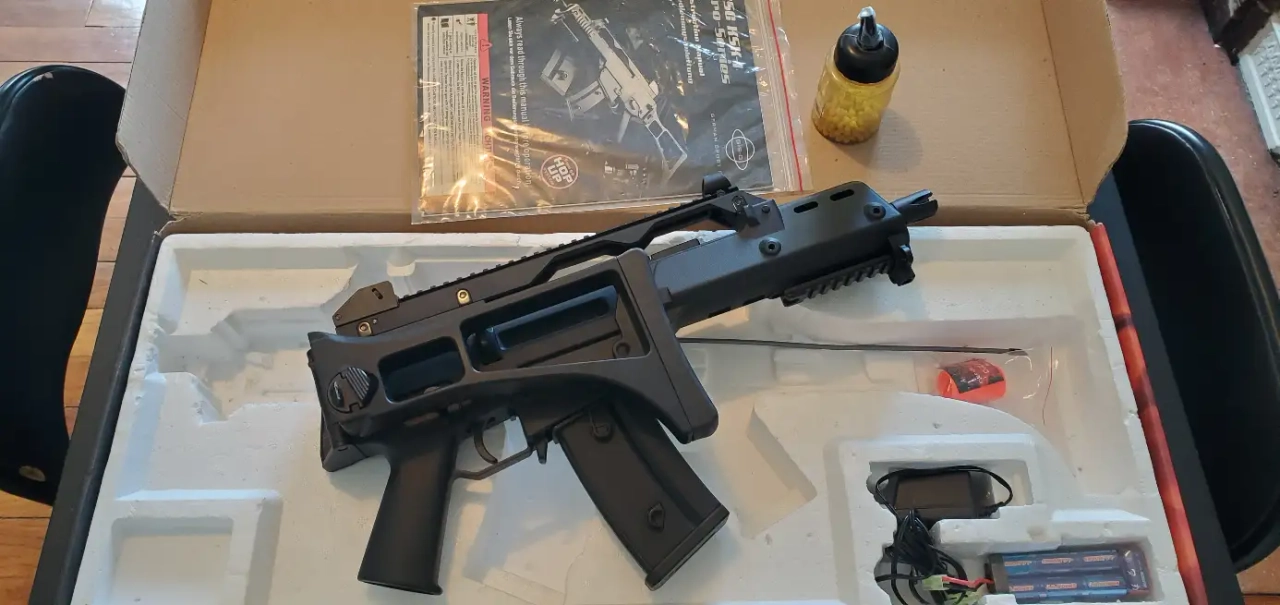 Bonjour, je vends cette réplique de G36c AEG de chez German Sport Gun achetée il y a une dizaine d'années mais jamais utilisée à part pour vérifier qu'elle fonctionne.