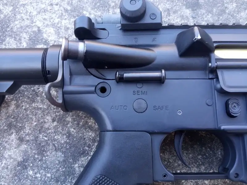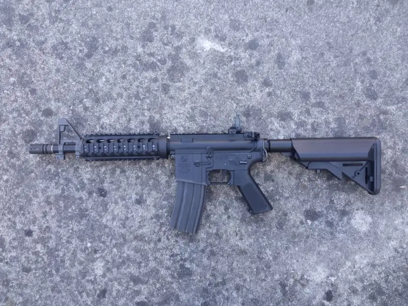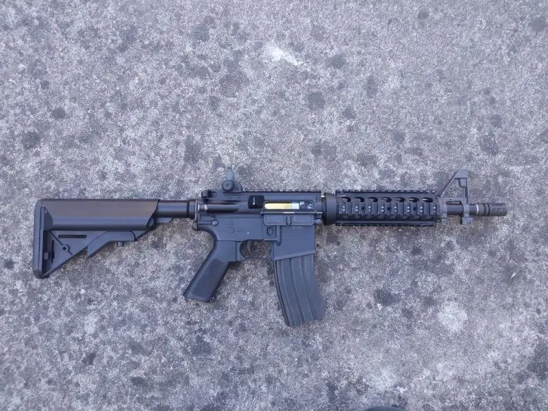 Réplique en bon état, custom de MK18 Mod.0 plutôt conforme (lower avec marquages gravés M16A1, poignée-moteur A1, rail RIS avec vis à l'avant en T1). Il ne manque que les marquages "Crane, Indiana" sur le côté droit du puits du chargeur, à faire au laser ou à coller en sticker trouvable sur Aliexpress si vous souhaitez avoir ce soucis du détail.