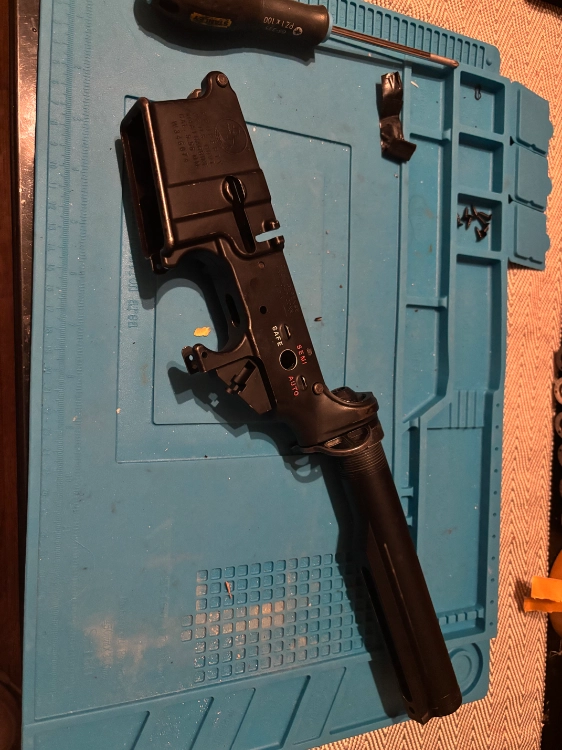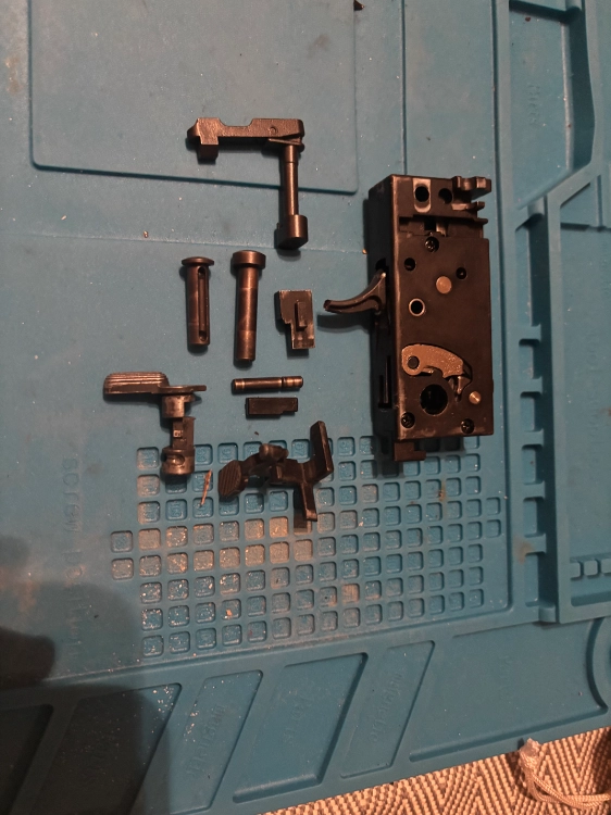 sur le lower je laisse tube de crossebuffer ressort les goupilles sélecteur bloc détente complet fictionnel la queue de détente est a change car elle a a casser suite a une chute goupilles d’avance système d’éjection du chargeurs
