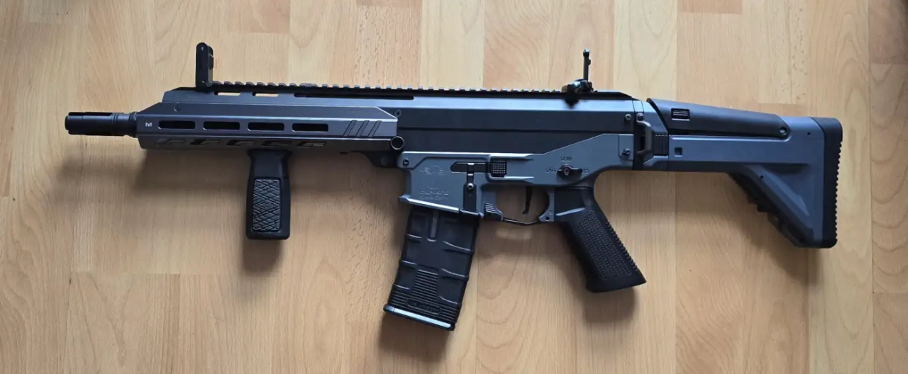 Elle a été légèrement modifiée pour de meilleures performances : le canon d’origine a été remplacé par un canon de précision Poseidon Air Cushion en 6.05 mm x 300 mm et le joint hop-up par un Unicorn 60° avec appui soft.