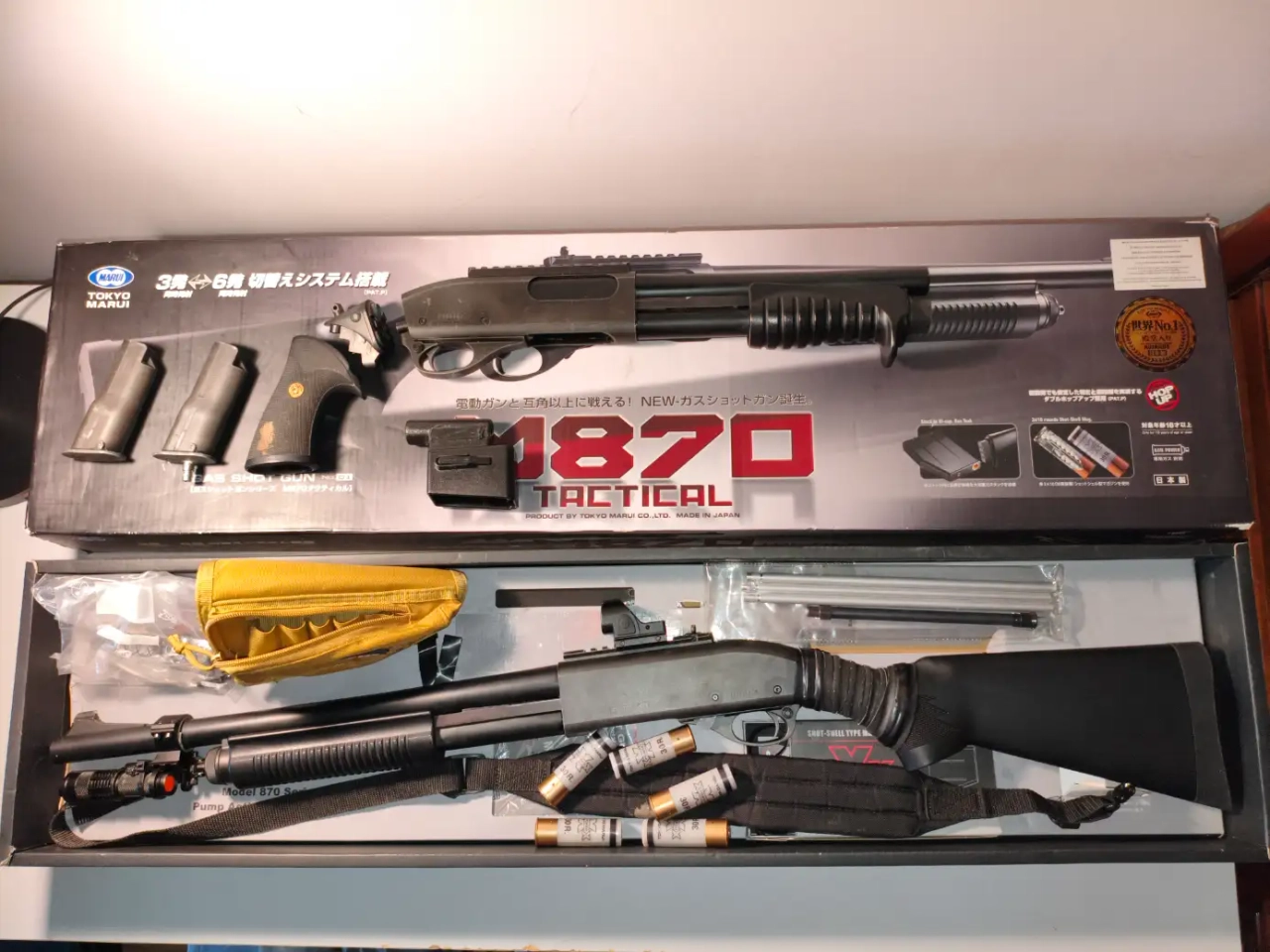 Je le vends avec un Breacher Marui pour pièces, ce qui permet de monter la poignée du breacher sur le m870 à la place de la crosse, en montant le chargeur du breacher avec la valve UE on peu jouer en hPa.