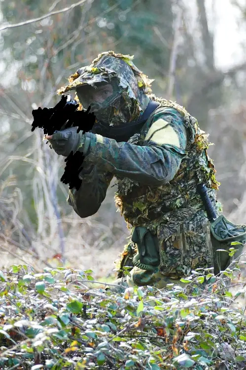 J'ai intégré au haut une ghillie sur le torse et dos + une capuche. Ensemble vraiment efficace niveau camo, surtout dans les bois.