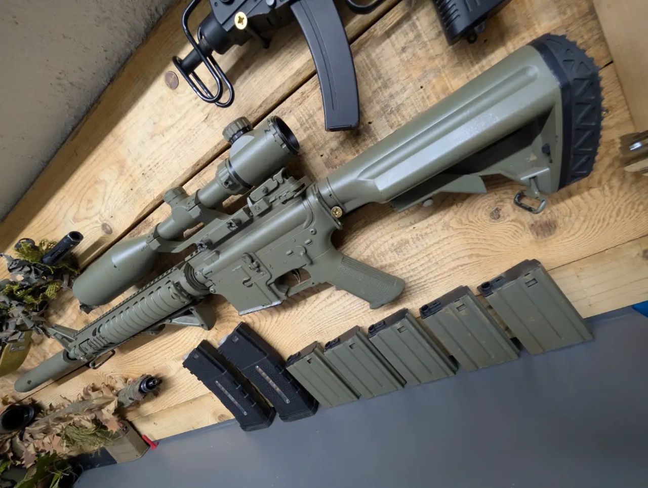 J' ai aussi récemment changé récemment le bloc hop up cependant par un shs gen 2 , le nouveau ne permet plus de mettre les chargeurs court dessus en l état mais je fournis deux chargeurs longs avec fausse douille apparente qui eux vont très bien , ainsi que 5 chargeurs court type Vietnam aux couleurs de la réplique.
