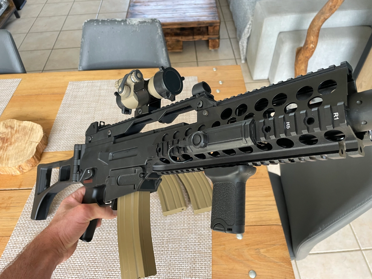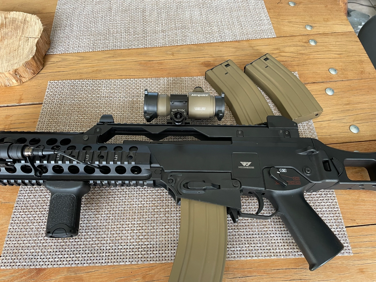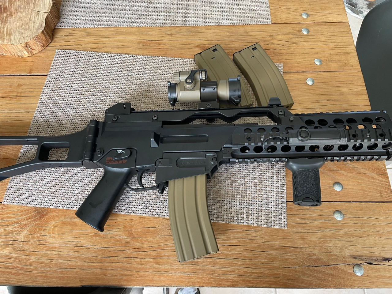 Vends g36 jing gong, 2 parties à son actif,red hot point rouge, lampe ultrafire avec commande deportee, 3 chargeurs m4 métal 140 billes, j ai toujours l adaptateur d origine avec son chargeur ,moteur Hi torque shs, ressort m100, poignée tactique, batterie 11,1v 1100mh