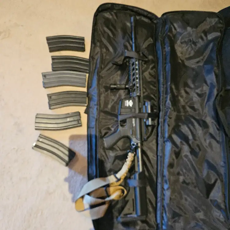 Vends M4/M15 Machine Combat en métal et ABS, avec batterie lithium et chargeur, viseur point rouge/vert, 6 chargeurs, sangle et housse .