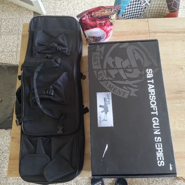 Sangle et poignée tactique équipé dessus, plus de 6000billes fourni, chargeur électrique avec 2 batterie pour tenir toute la journée sur les champs de bataille, chargeur BB rapide pour remplir les chargeurs de billes, housse de transport fourni, boîte d'origine...