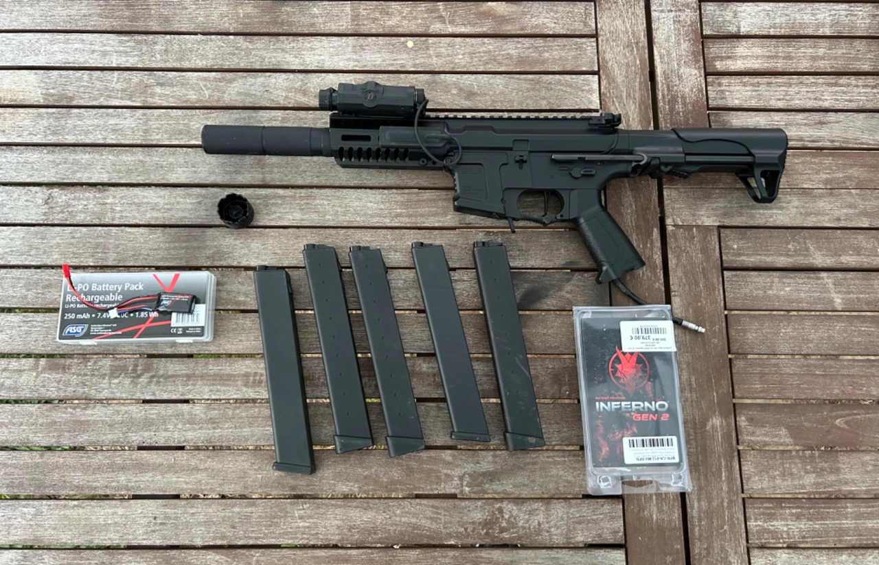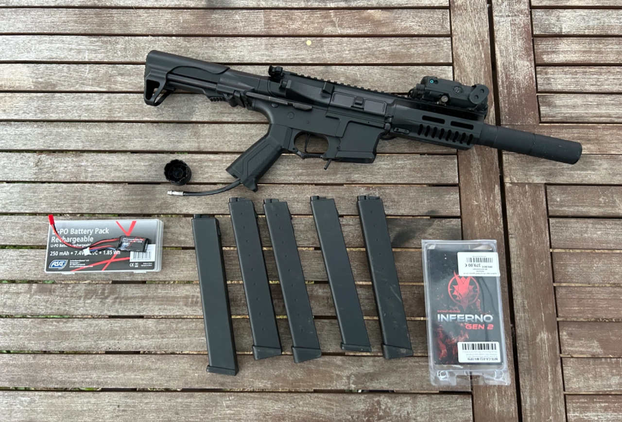 Vendu avec 2 chargeurs hi cap 250bbs / 3 mid cap 120 bbs, une batterie hpa, silencieux mousse et cache flamme d’origine et un boîtier peq lampe laser et switch deportee (pile à changer)