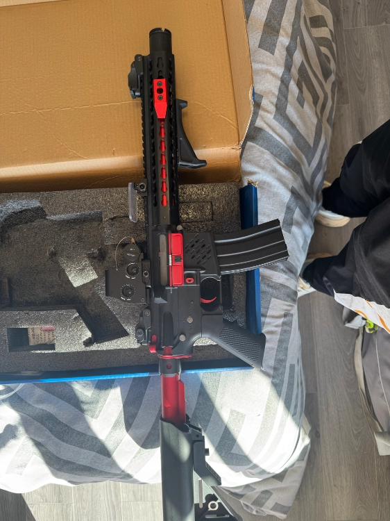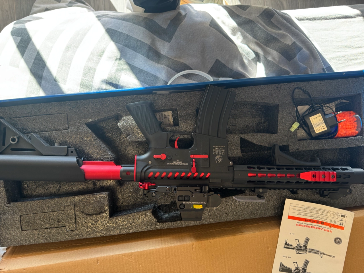Vend m4 blast red Fox utiliser 3 fois seulement avec batterie, chargeur, viseur holographique, poignet et ressort pour passer la puissance à 1joule (elle est à 1.2 joules actuellement)