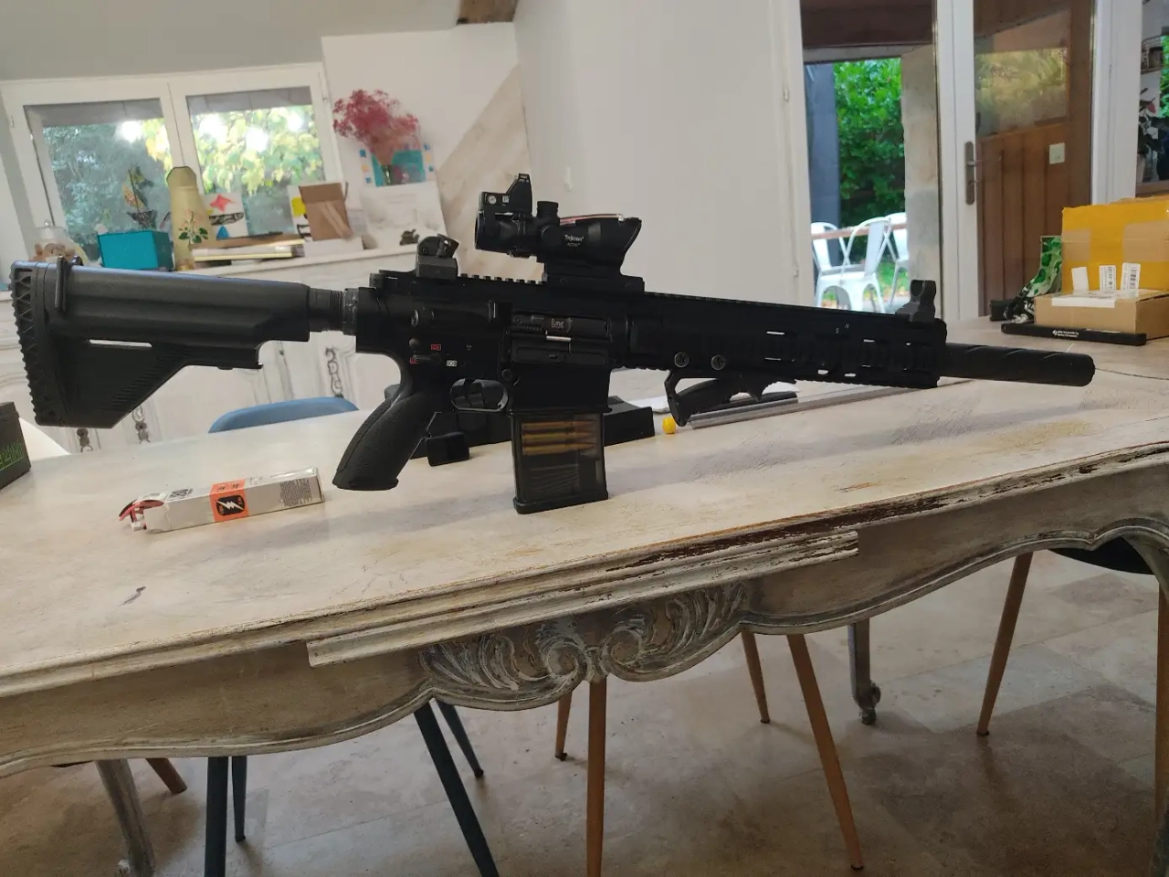 Je vends un superbe HK417 Marui NGRS (AEG avec effet de recul), avec pas mal d'upgrade. Il y a un canon long de précision, intégré dans le silencieux, un ressort m100 garder qui permet d'être a 1,34 j en 0,32g, piston et tête de piston renforcé, engrenage renforcé, mosfet titan, hop up mappleleaf ... bref la crème .
