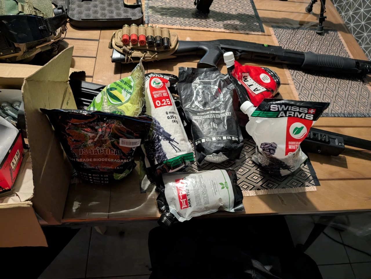 Un gilet tactique avec ceinturon casque et système de communication HD , j’ai plusieurs sac de billes et des sacs de transport avec,