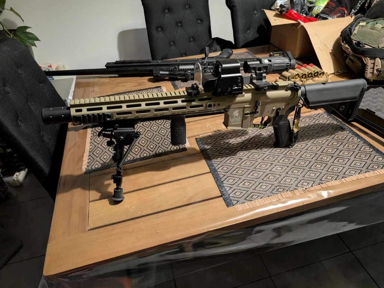 Un DMR lancer tactical avec canon de précision 6,02 , un triger sensitive, red dote avec magnifier, plusieurs chargeurs ainsi que plusieurs batteries.