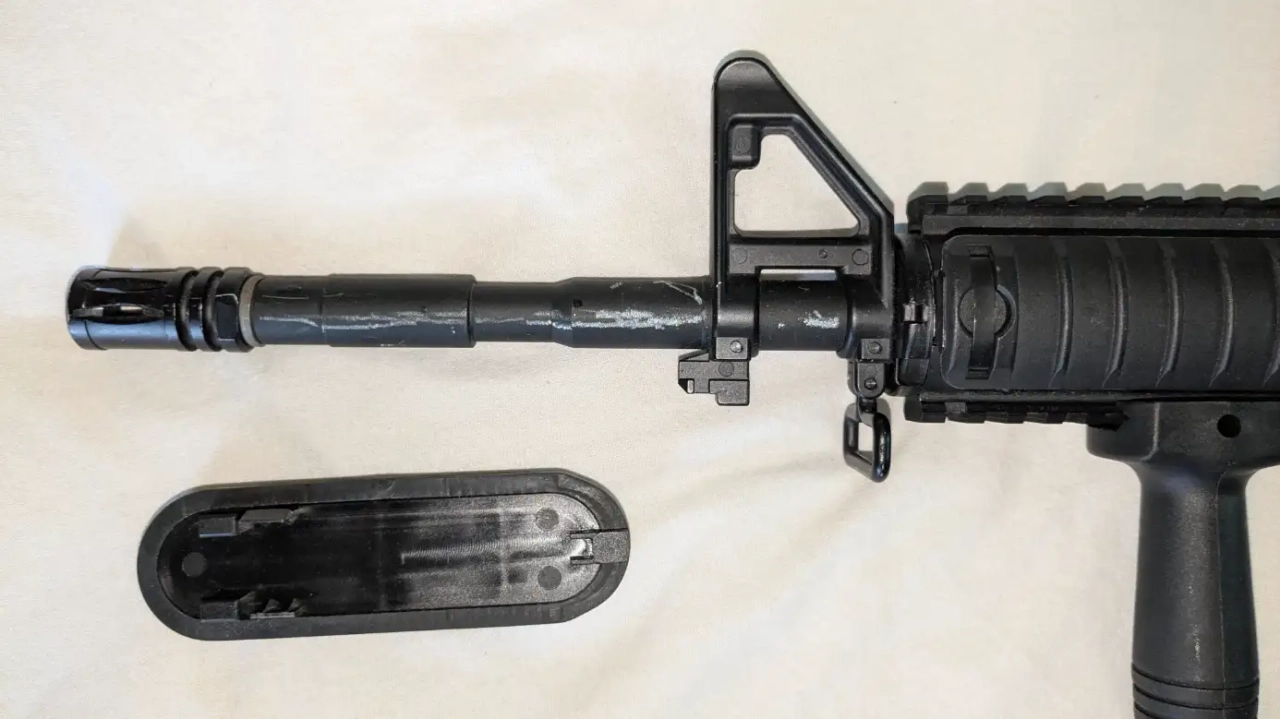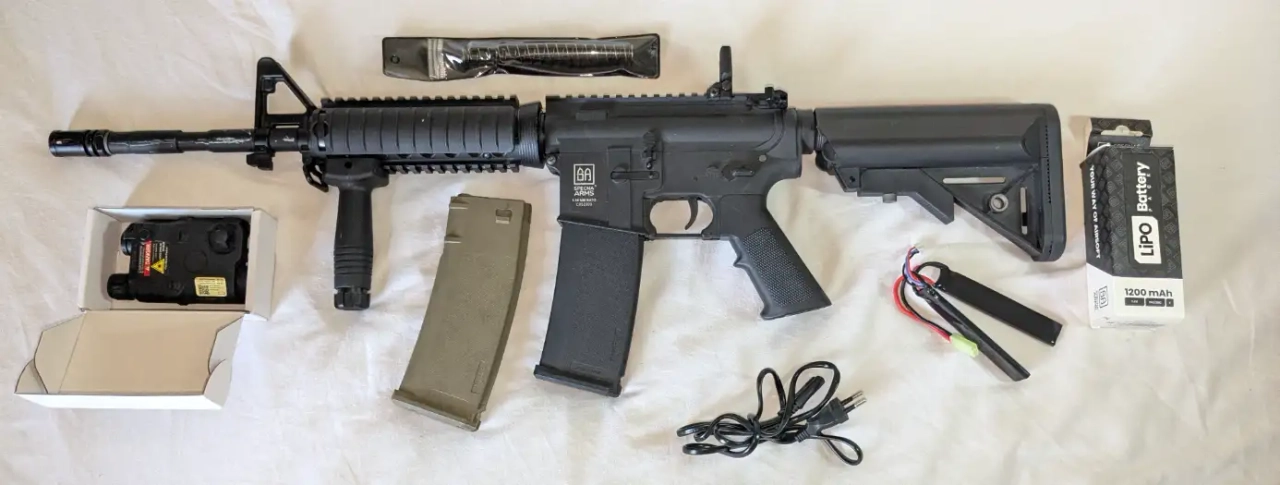 Bonjour, j'espère que vous trouverez le bonheur sur mon annonce! Donc cette réplique a quelques défauts, comme vous pouvez le voir sur les photos, le canon de l'arme et un peu rayé, et le cache de la crosse de la réplique (dans laquelle on met la batterie) est cassé dans petit bout de plastique mais ce clipse quand même très bien.
