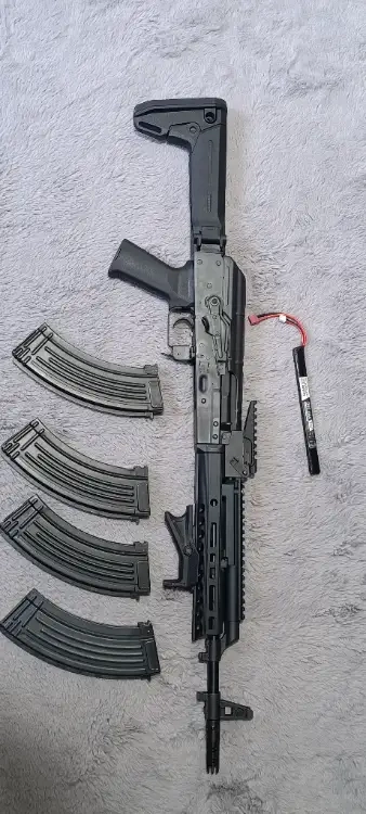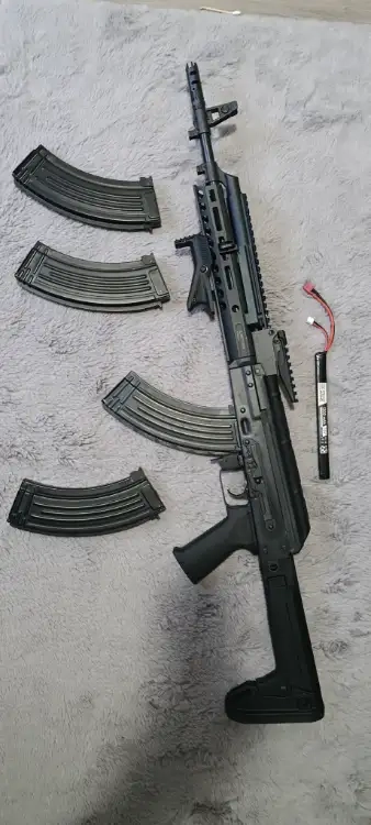 Elle viens dans sa boîte d'origine avec 3 chargeurs cyma, 1 chargeur Marui et le chargeur d'origine en hi cap et une batterie Lipo 7.4 format stick AK