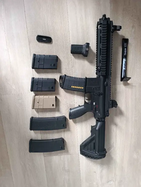 Bonjour, je vend ma réplique H20 (mire + poignée + crosse + 2 chargeurs d'origine et le ressort de remplacement inclue avec la réplique) ainsi que des chargeurs type M4 (3 petite capacité et 1 grande capacité)
