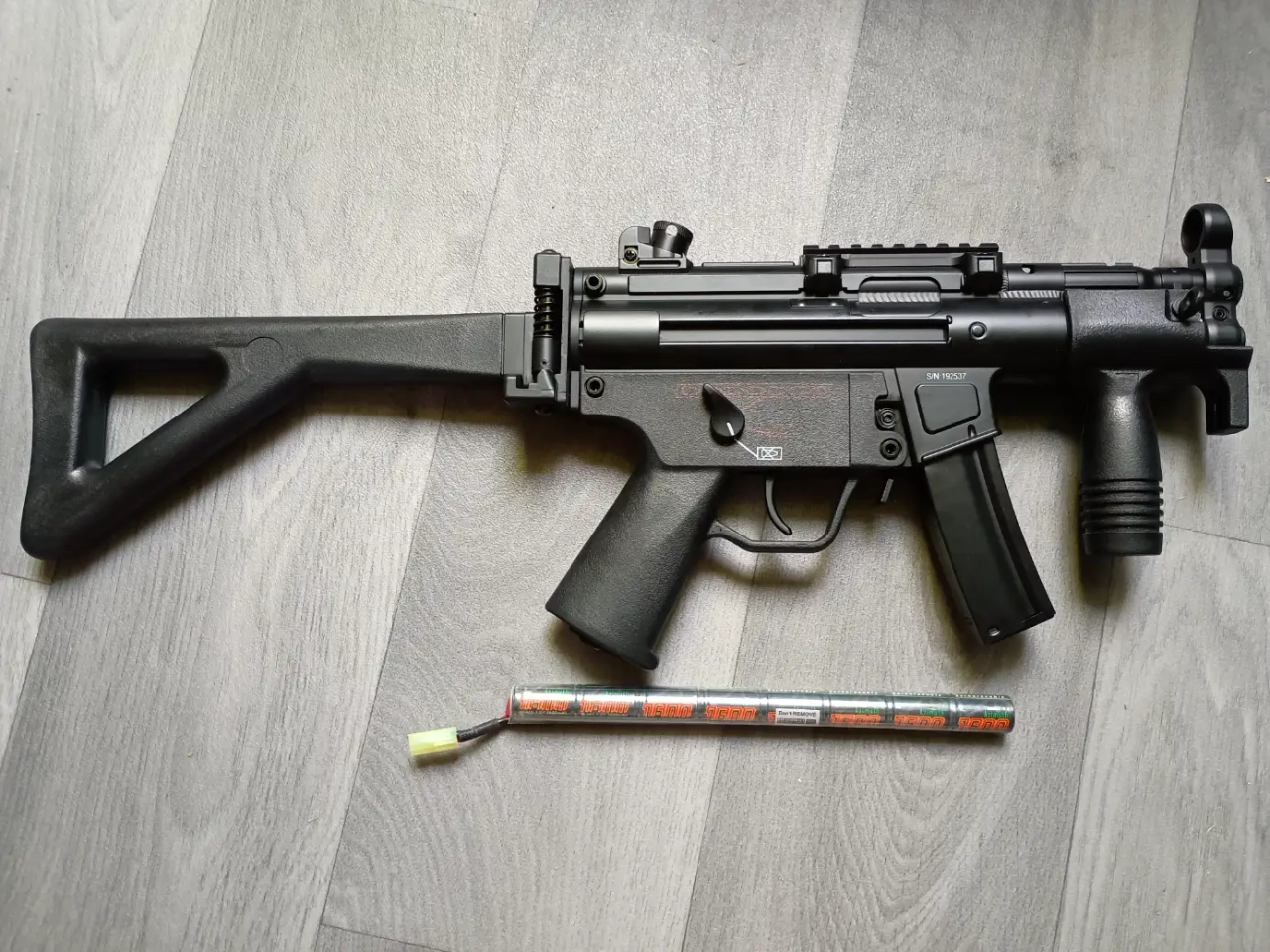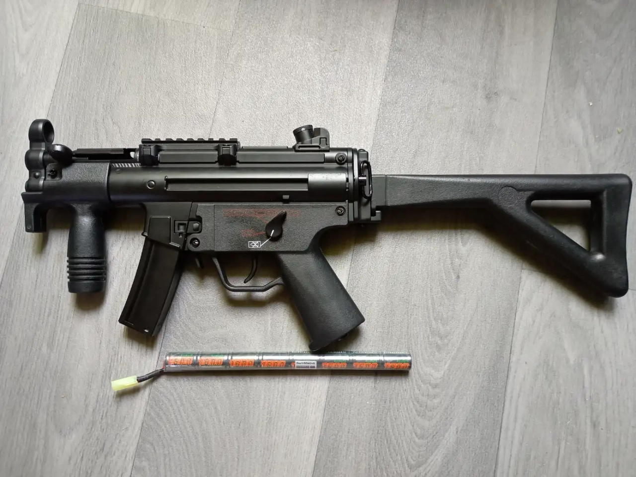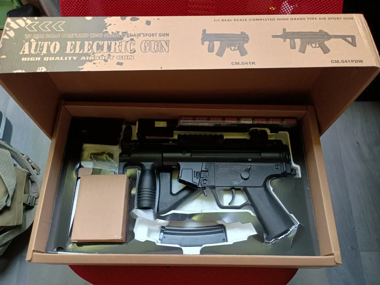 Fournie avec une batterie stick 9.6V 1600mah (elle sort 1J avec cette batterie), un chargeur, et le rail picatinny. J'ai mis un embout de canon court, celui avec le porte silencieux est fourni dans la boite.