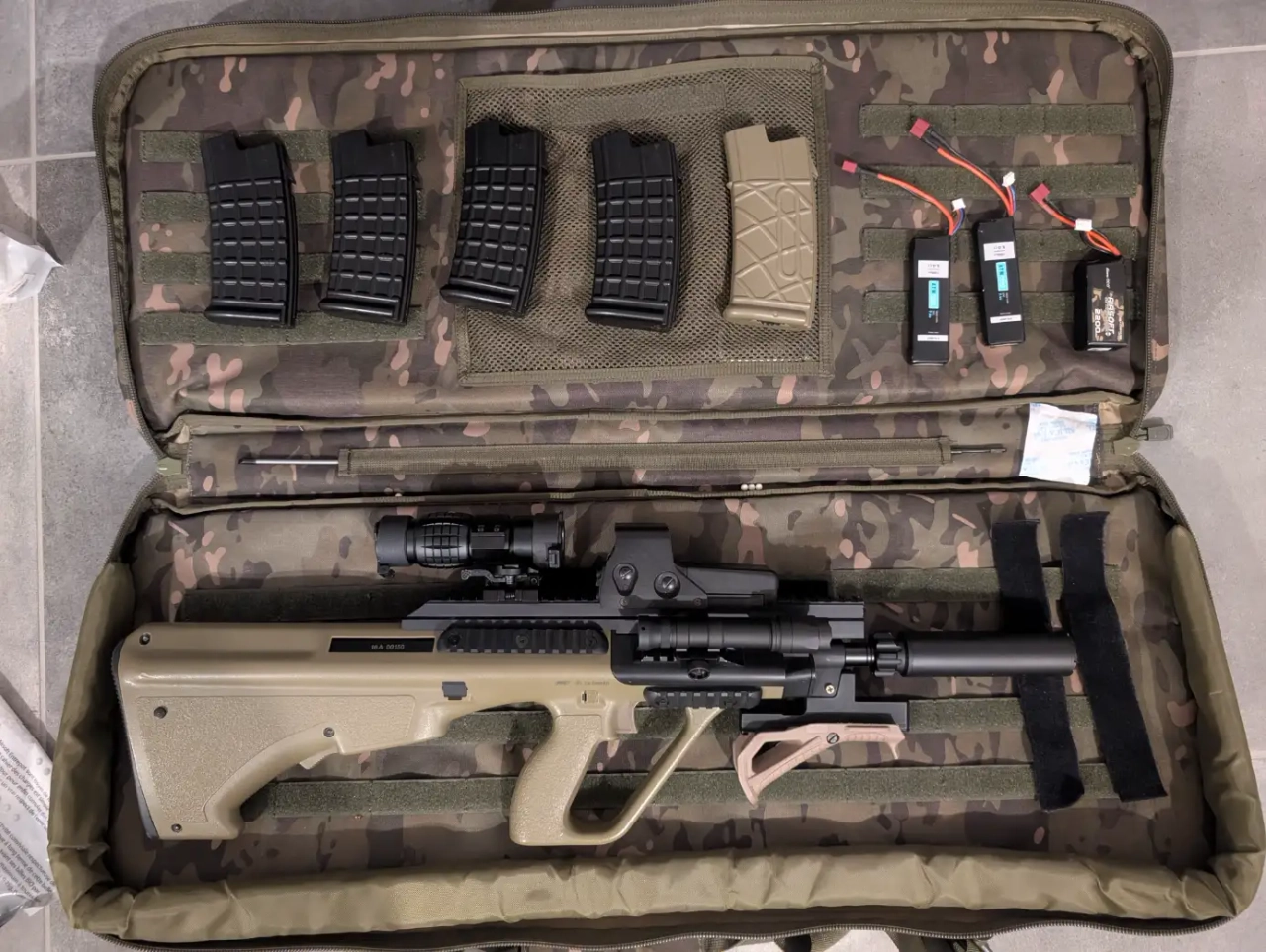 La réplique est fournie avec 4 chargeurs midcap et un highcap, 1 batterie en 11v qui donne une cadence et réactivité impressionnante, et 2 batterie en 7,4v qui restent parfaitement agréable à jouer,un chargeur de batterie.