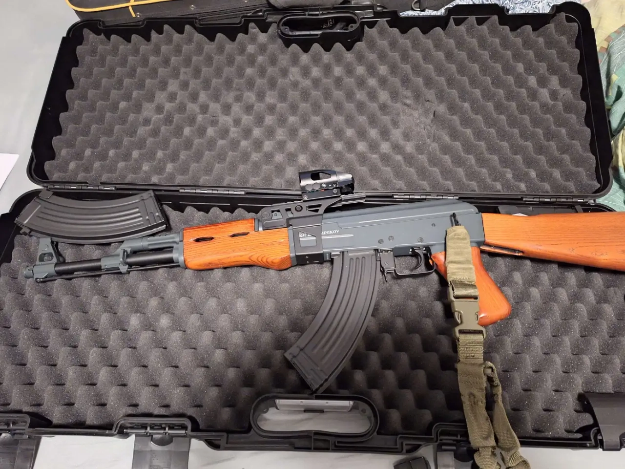 J'ai récupéré cette réplique à un ami qui ne l'utilise plus sauf que moi non plus ( lol ), je n'ai pas les outils ni les infos concernant la puissance de la réplique, je sais juste qu'elle fonctionne avec batterie ( Airsoft Batterie 8.4V 1600mAh NiMH ), j'en ai une avec d'ailleurs, outre cela elle a la culasse qui bouge même si c'est une AEG, il l'a achetée a 150€ sur un site douteux donc je baisse pas mal le prix en conséquence, avec ceci il y a un point rouge qui fonctionne avec pile ( que je ne connais pas ), je le vend avec ses 2 chargeurs eux aussi en métal et avec une capacité de a minimat plus de 100 billes. Toute la réplique est en bois/métal, je la vend avec une sangle en 1 point aussi ( pas de charges supplémentaire )