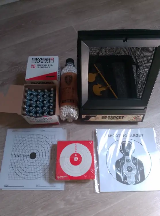 L'arme n'a servi qu'une seule fois.Je vends avec une cible avec feuilles et filet,50 cartouches de CO2 et une bouteille de billes.