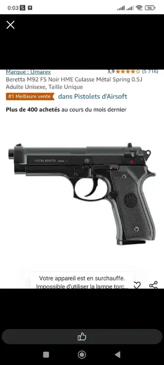 - Pistolet beretta métallique, puissance 0.5 joules,
