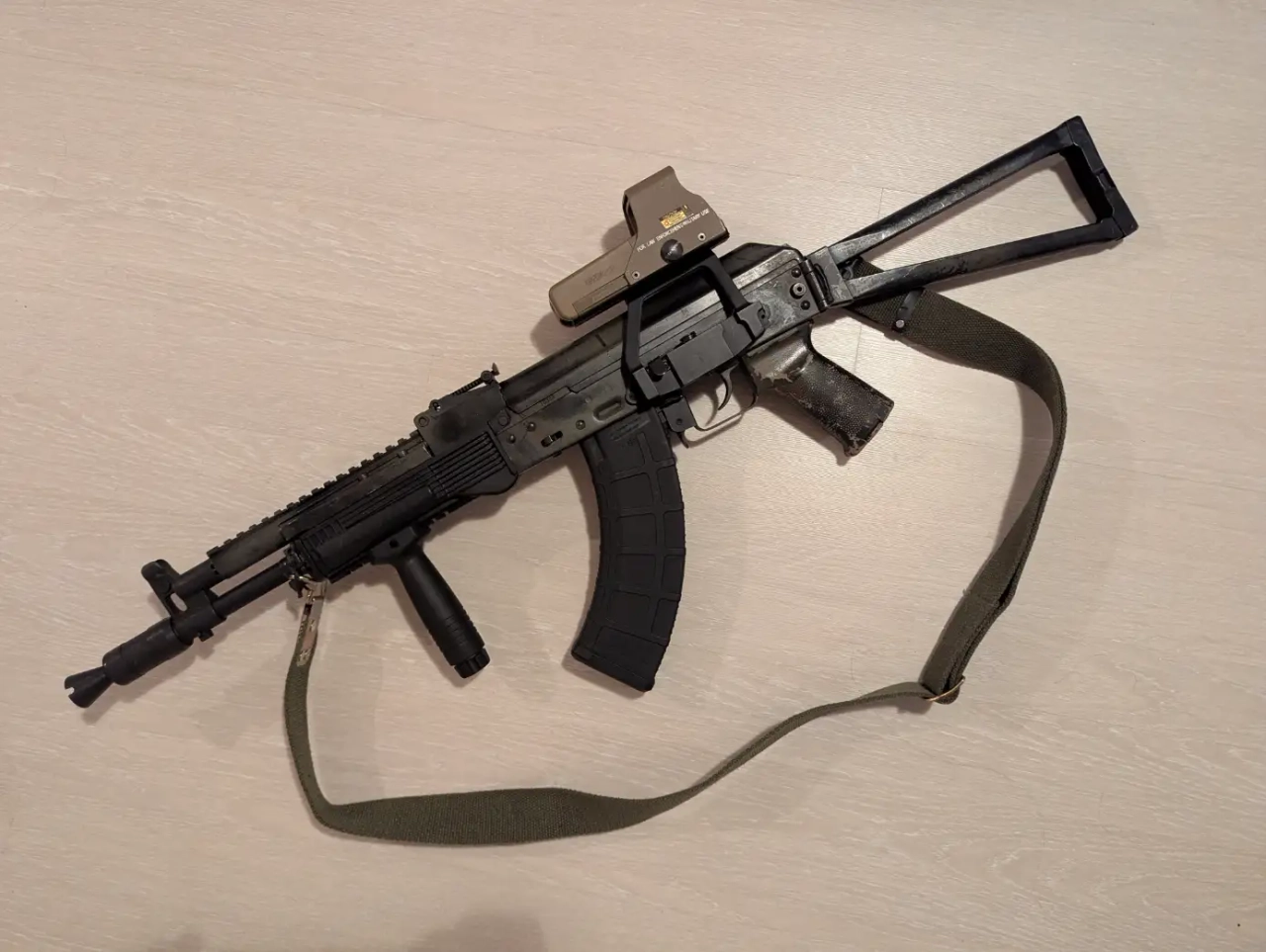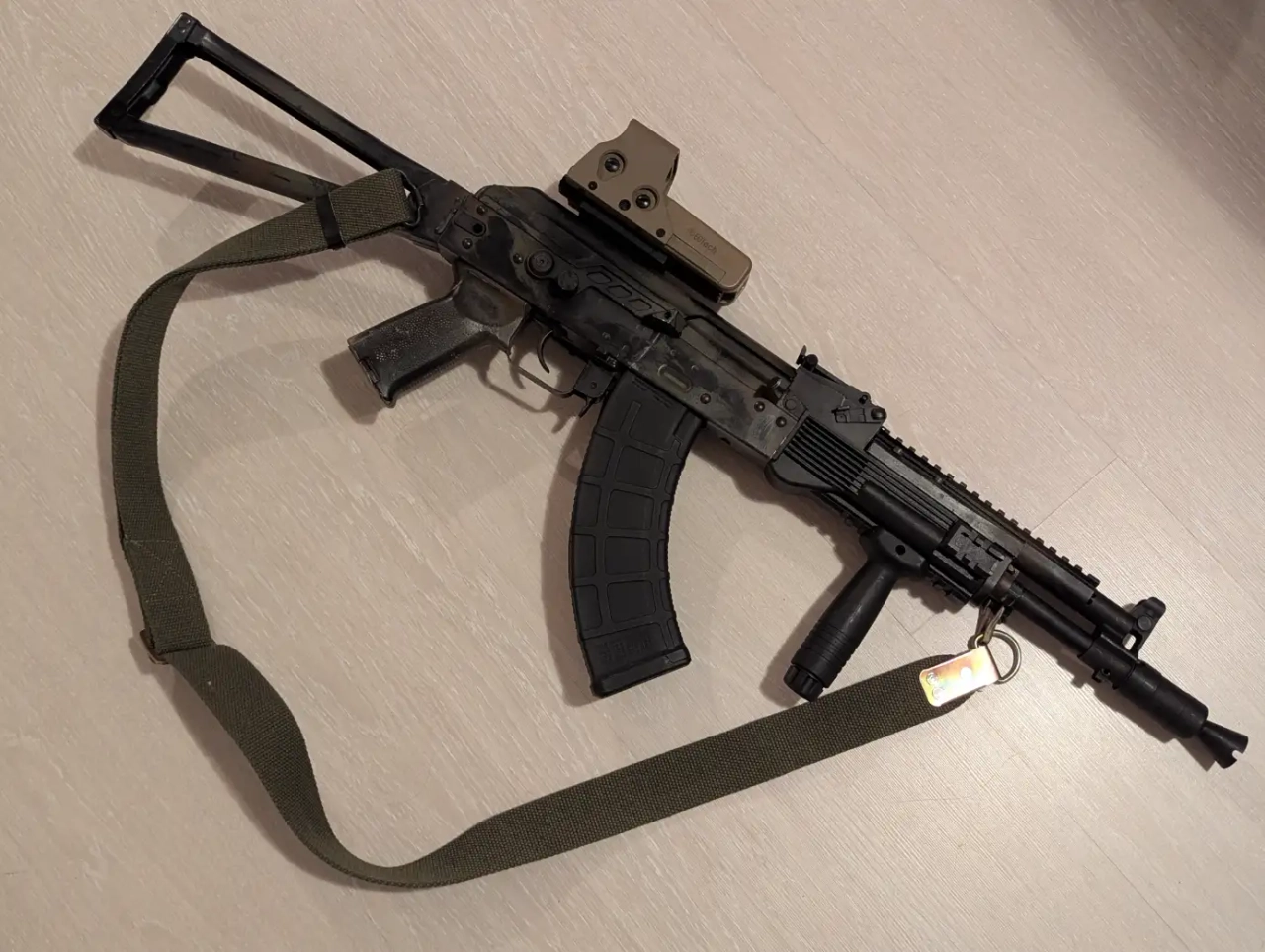 En externe, on retrouve un garde main type ak101 avec rail à 3 et 6h, un gas tube à rail Picatiny type Ultimak, une crosse squelette RS d'AKs74, un pistol grip type Magpul (tan de base), un grip type KAC (peut être remplacé par un AFG 2 cheap sur demande), un rail pour optique ainsi qu'un Eotech 552 de chez Holy Warrior (neuf). Le selecteur de tir a été changé par un sélecteur tacticool 5ku.