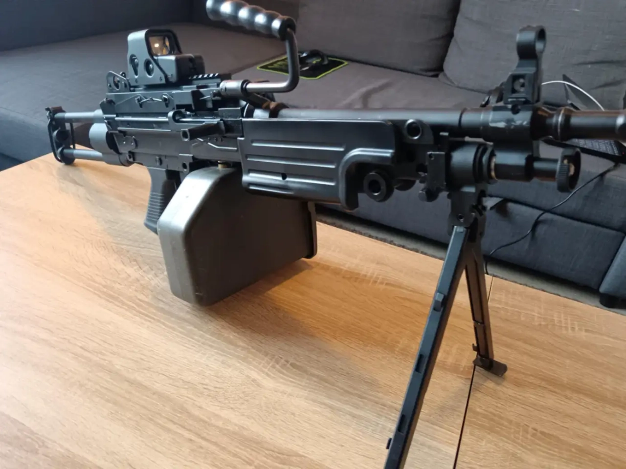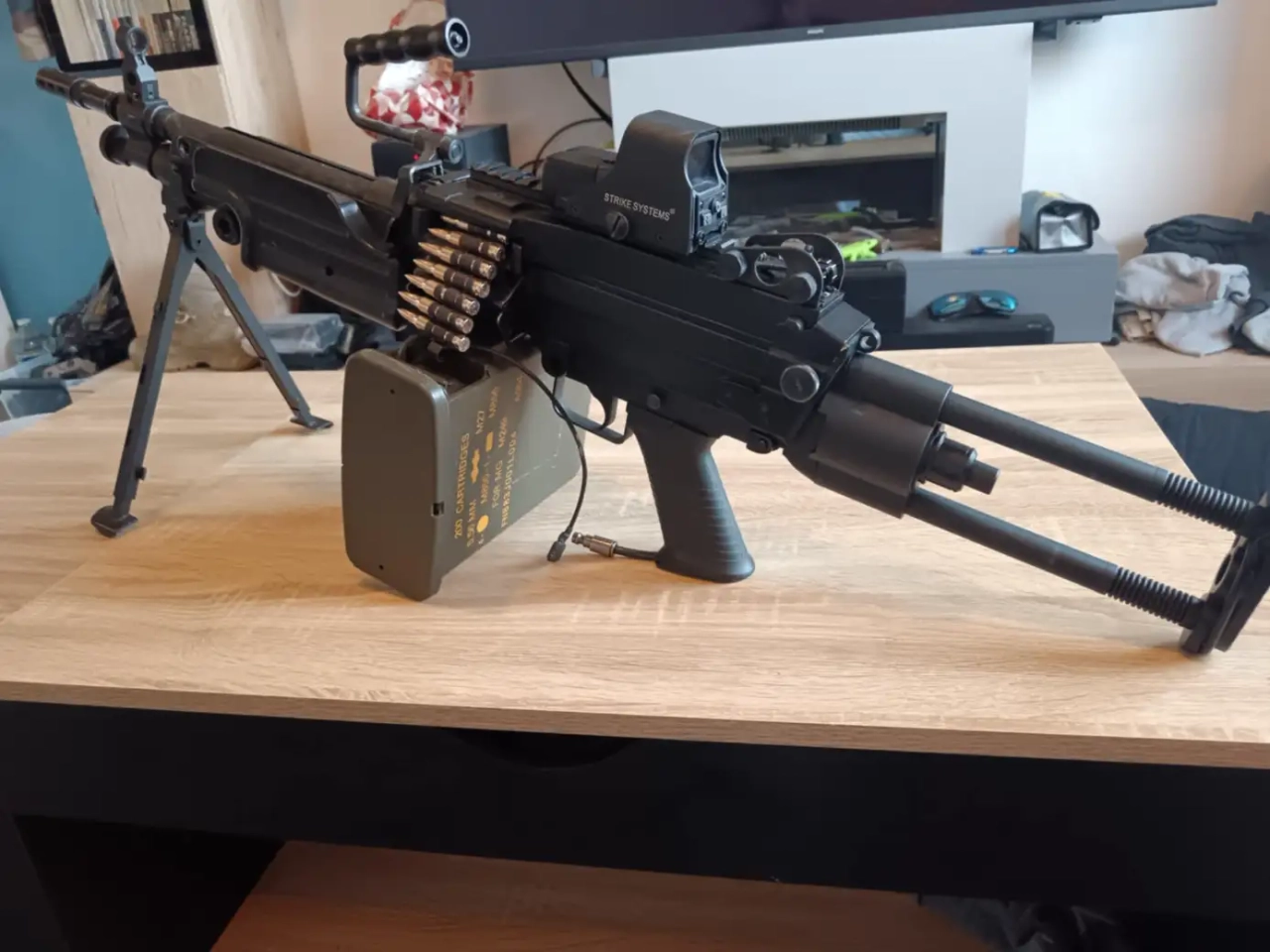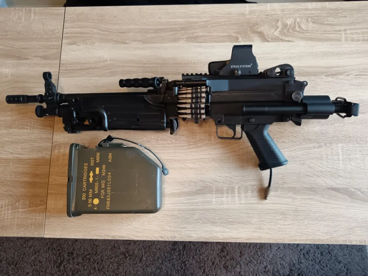 Fourni complet comme sur les photos avec bipied, ammobox fonctionnelle, et bande de fausses cartouches 5.56mm. (possibilité d’ajouter kit HPA contre rajout)