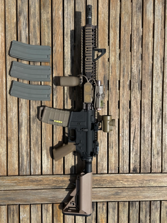 VFC M4 VR16 en version AEG. Cette réplique a subi quelques modifications internes, toutes faites par des shops airsoft. Les modifications internes sont les suivantes :
