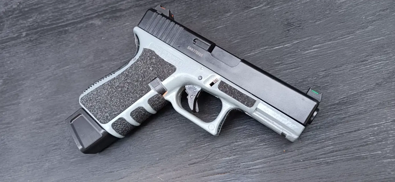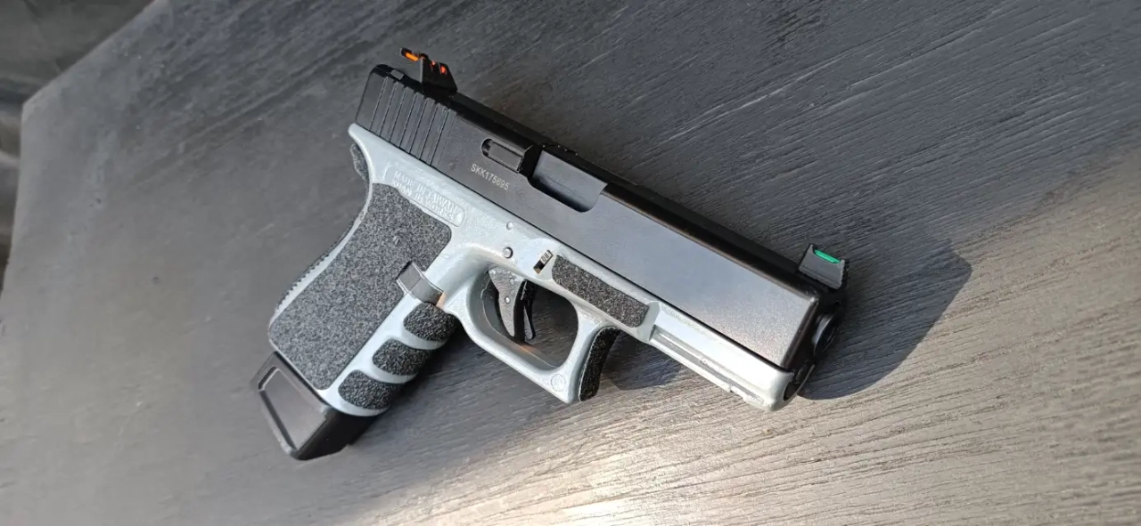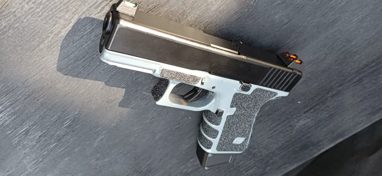 Réplique personnalisée avec poignée antidérapante, talon allongé et organes de visée en fibre optique.