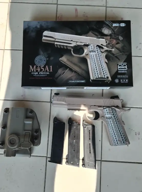 M45 tan marui: neuf, 1 partie, 3 chargeurs(2 marui), holster adaptx. Le tout dans sa boîte. Fonctionne parfaitement.