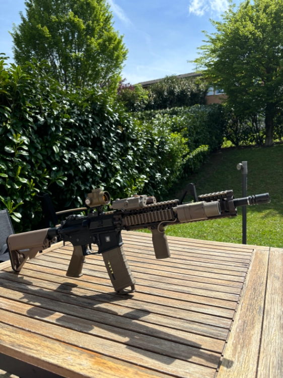 VFC M4 VR16 en version AEG. Cette réplique a subi quelques modifications internes, toutes faites par des shops airsoft. Les modifications internes sont les suivantes :