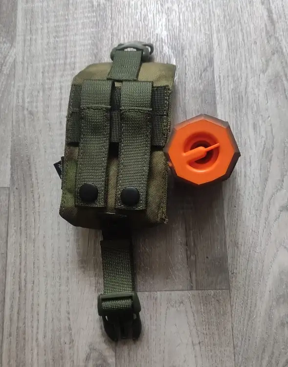 La grenade a été peinte en Vert Olive pour ne pas casser le Camouflage mais le bas de la grenade est toujours orange fluo pour la trouver rapidement.