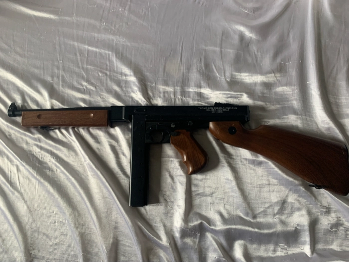 Je vend ma Thompson acheter au usa vrai marquage calibre .45 etc… vrai bois et métal chargeurs de 350 billes. Custom possible.