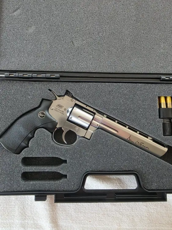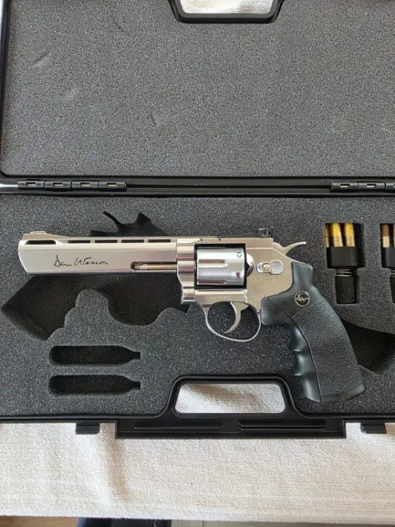 Je vends mon Dan Wesson 6 pouces Co2. Il est en bon état et est fonctionnel. Le barillet bouge un peu lors du déclenchement de la queue de détente. Il est vendu avec sa malette, 6 douilles basse puissance et 6 douilles haute puissance. Le rail supérieur est aussi fourni pour monter un organe de visée.