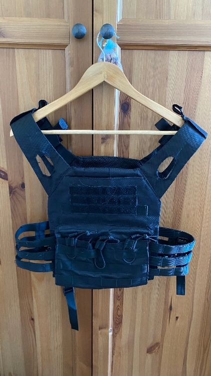 Gilet porte plaque léger et réglable, avec poches pour chargeurs et attaches velcro.