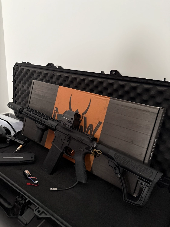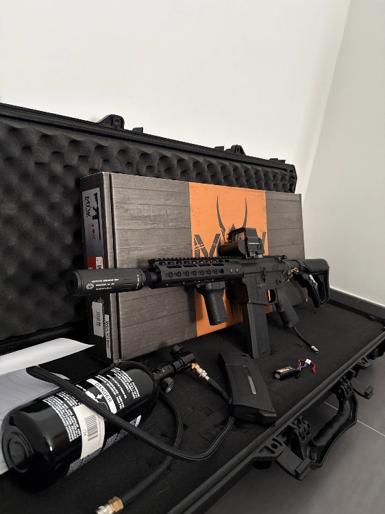 Je la vends avec une mallette de transport, + un viseur holographique + bouteille HPA et gaine US. (Facture disponible)