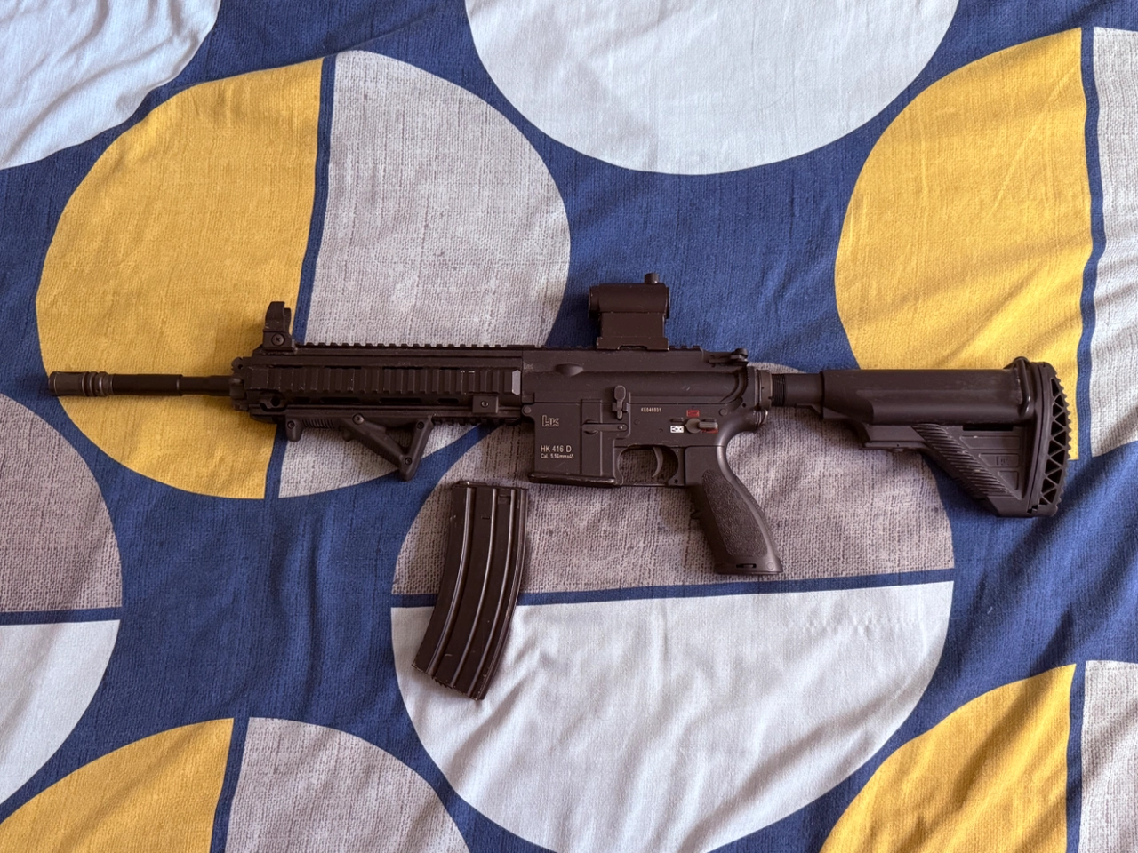 Je vends ma HK 416 D de marque VFC, équiper avec une poignée inclinée, un viseur point rouge, l’interne a été modifié, il y a un moteur hi-torque, canon et le joint ont étaient changé.