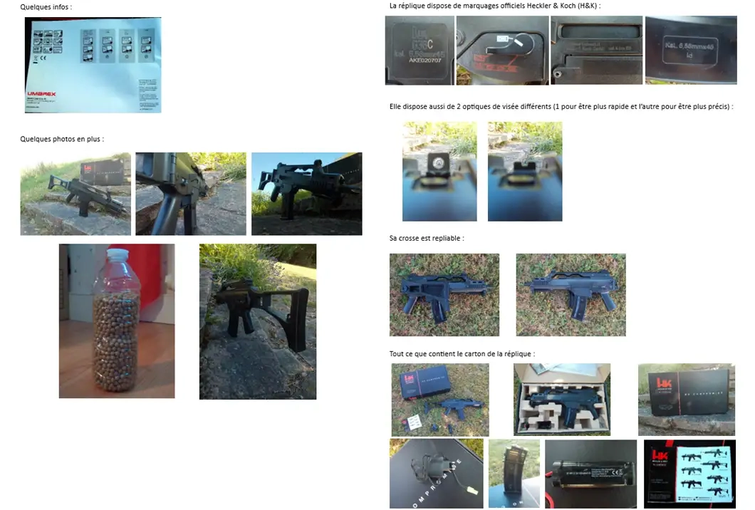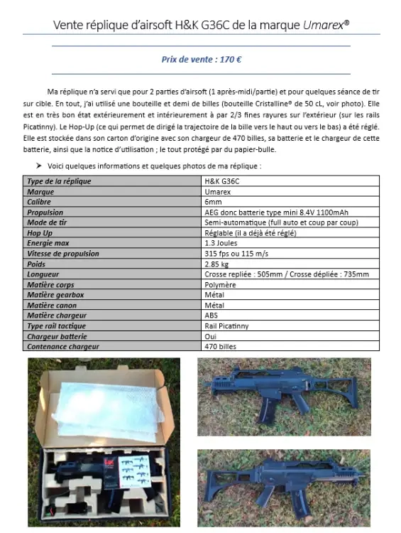 je vends ma réplique, un H&K G36C, car j'ai eu une opportunité très rentable sur une autre réplique. Je l'ai acheté à 200€ en 2023, et elle dispose des marquage officiel H&K.