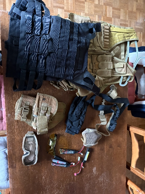 En équipements : 3 gillets tactiques, 2 paires de lunettes de protection, un masque de protection, 2 cache bouches, 2 paires de gants, 2 sangles pour tenir les répliques.