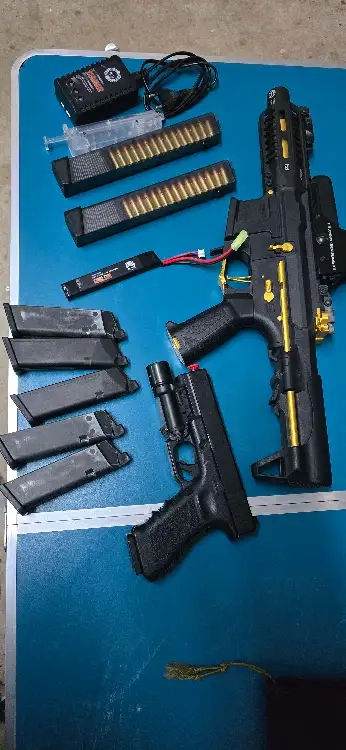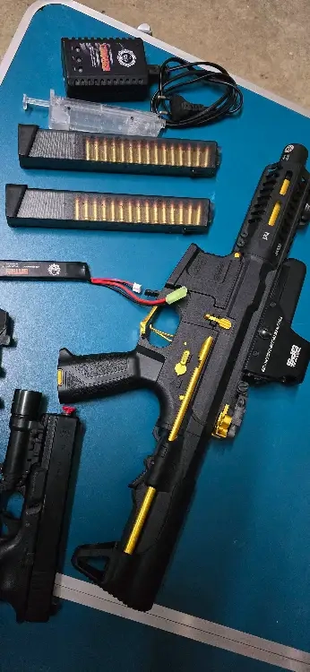 le premier et un ARP9 Steath Gold de chez G&G avec un chargeur de Lipo , une Lipo de 7.4V 1300 MAH 15 C , un point rouge tactical OPS , un speedloaoder et un deuxième chargeurs de 60 billes avec fausse balles comme celui fourni avec la réplique .