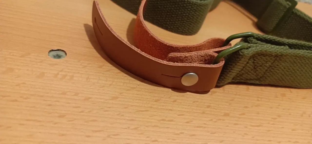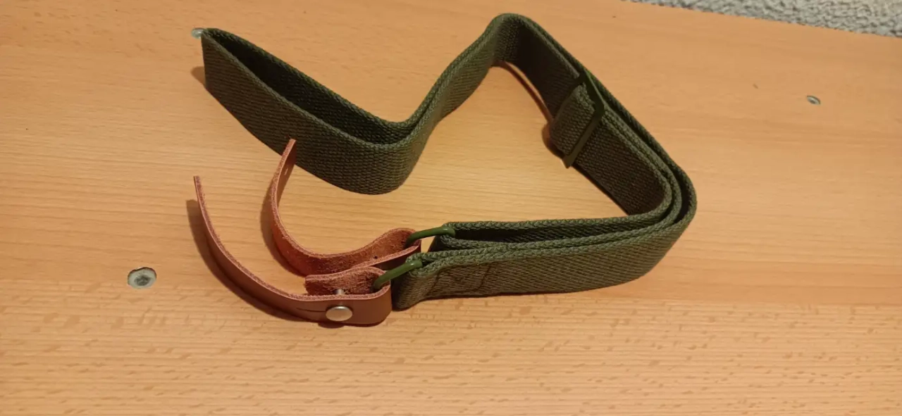 Sangle kaki style soviétique en une sorte de para-corde, cuir et embout en métal