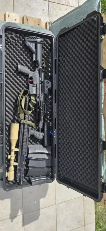 Le tout est fourni avec une valise rigide à roulettes, 8 chargeurs, 1 sangle 2 points, 2 batteries, 1 chargeur de batterie.