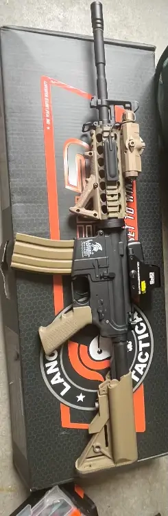 Je mets en vente ma réplique airsoft LT-04 GEN2 M4 RIS de chez Lancer Tactical, version Dual Tone (corps noir + accessoires tan), en excellent état et entièrement équipée, prête à jouer !