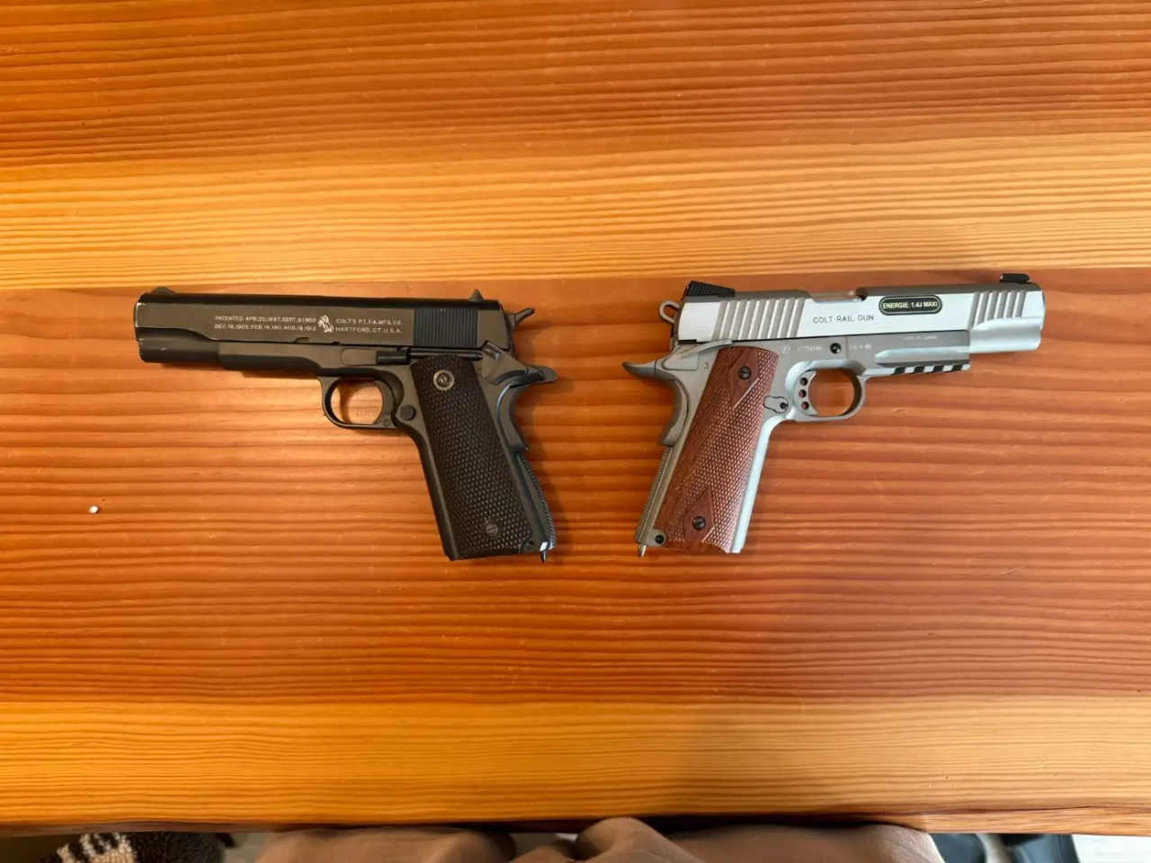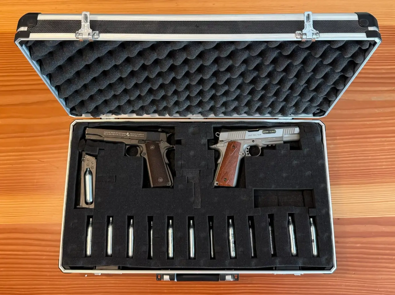 Je vends ces deux répliques avec leur caisse de transport. Le M1911 Noir a servi deux/trois fois, l'autre jamais.