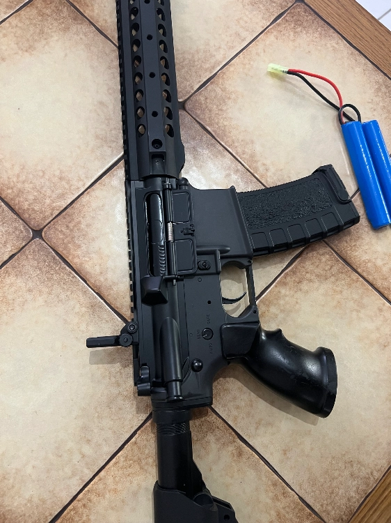M4 AEG couleur noir et gris, réplique propre en extérieur, garde mains aluminium.