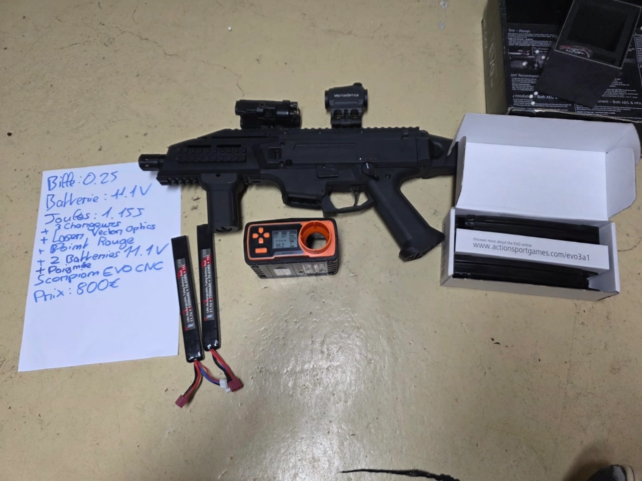 Vient avec 3 chargeurs, laser vector optic, red dot, 2 batteries 11.1V et une poignée