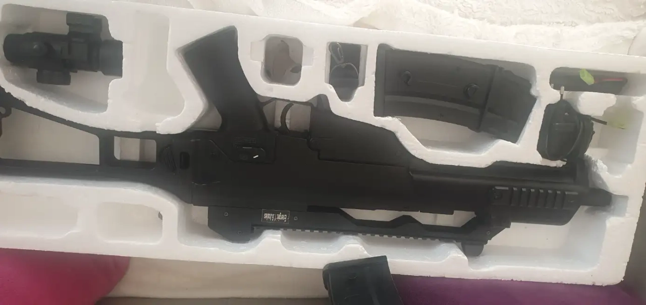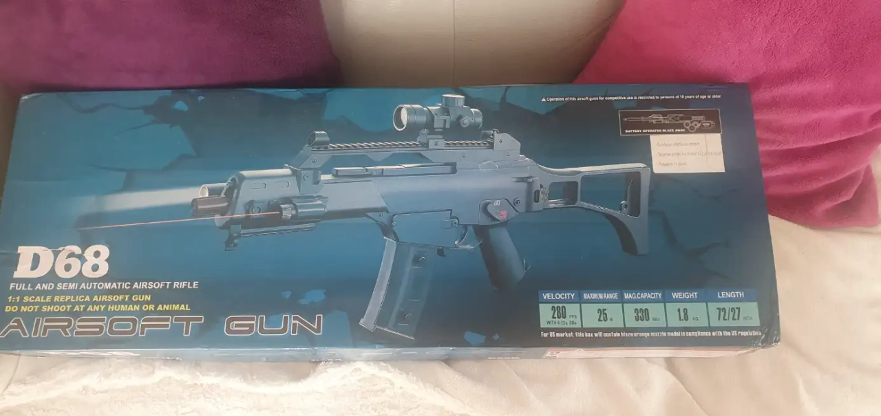 Vend G36 D68 de airsoft gun en très bon état avec 2 chargeurs lea batterie et le chargeur, 1 sangle et une lunette de viser le tout dans ça boîte d origine.elle fais 280 fps . Livraison à domicile si possible. Je ne peux pas mettre de photos si intéressés me demander pour 📷