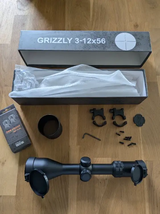 Vend cette Lunette de visée Grizzly 3-12x56 SFP fournie avec une paire de colliers Picatinny 30mm et protection flip up. Achetée neuve à 180€. Emballage d'origine et facture fournies.