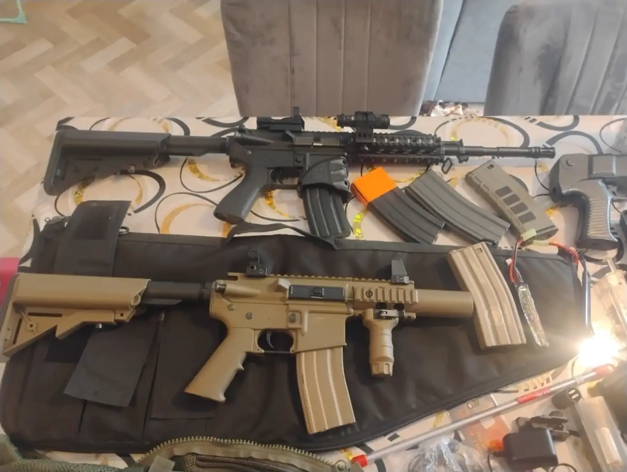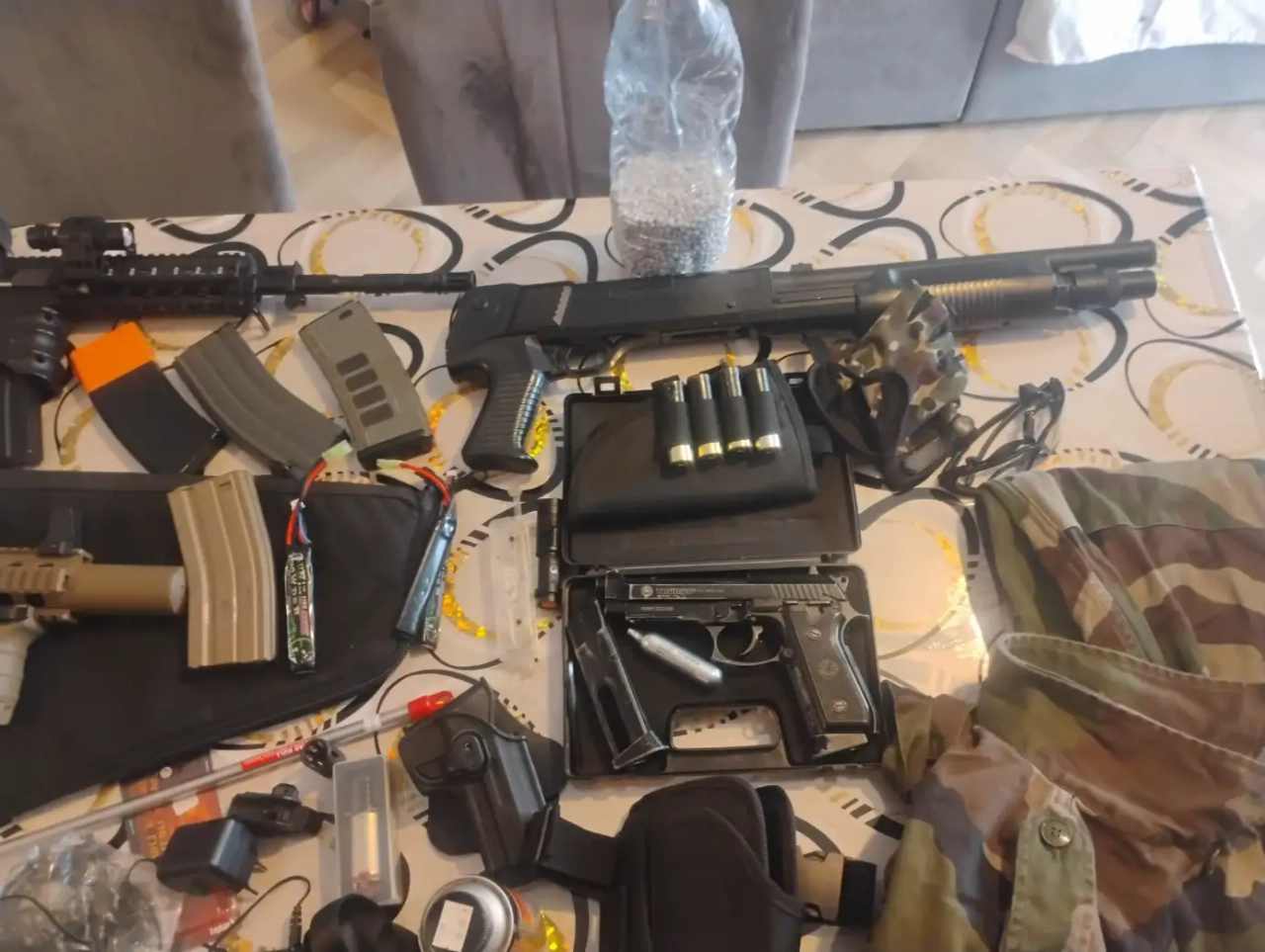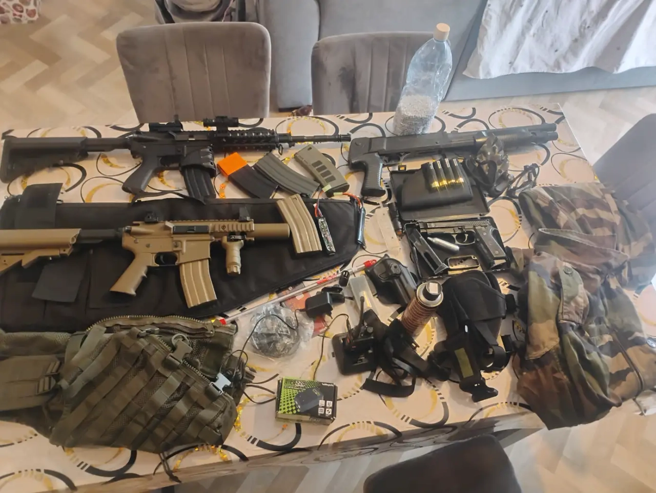 Bonjour je vends le lot complet avec deux répliques 1 PA un fusil à pompe un talkie-walkie un gilet tactique lunettes de protection chargeur de batterie et plusieurs accessoires vend le lot pour 300 € me contacter pour plus de renseignements cordialement.